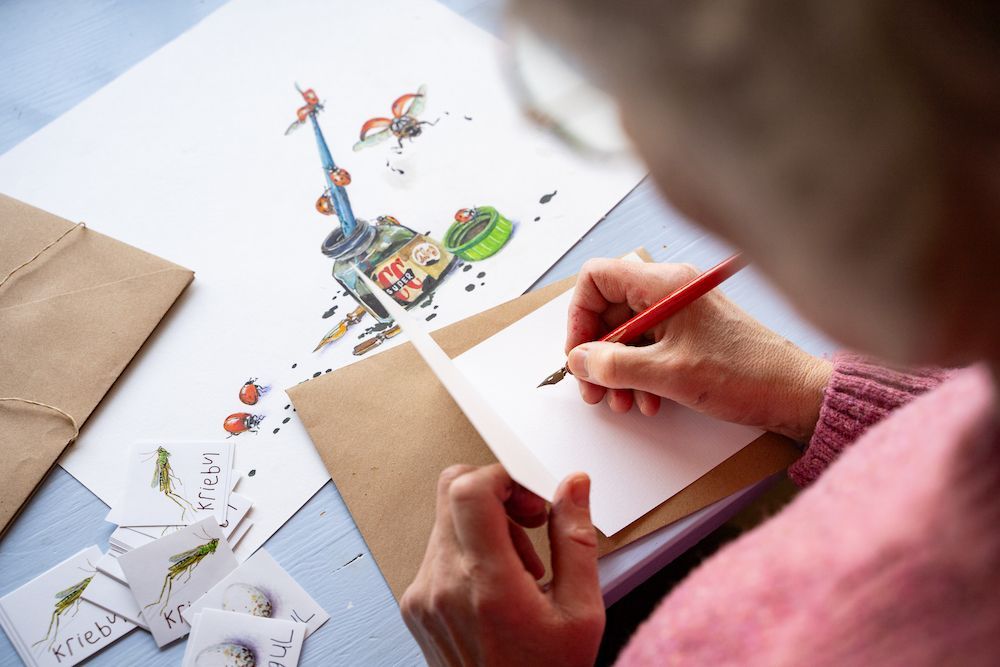 Wat is er veel te ontdekken het op het gebied van illustreren! Voor mijn beelden maak ik gebruik van aquarelpotloden, acrylstiften, acrylinkt, fineliners, linosnedes en wat er nog meer op tafel ligt.