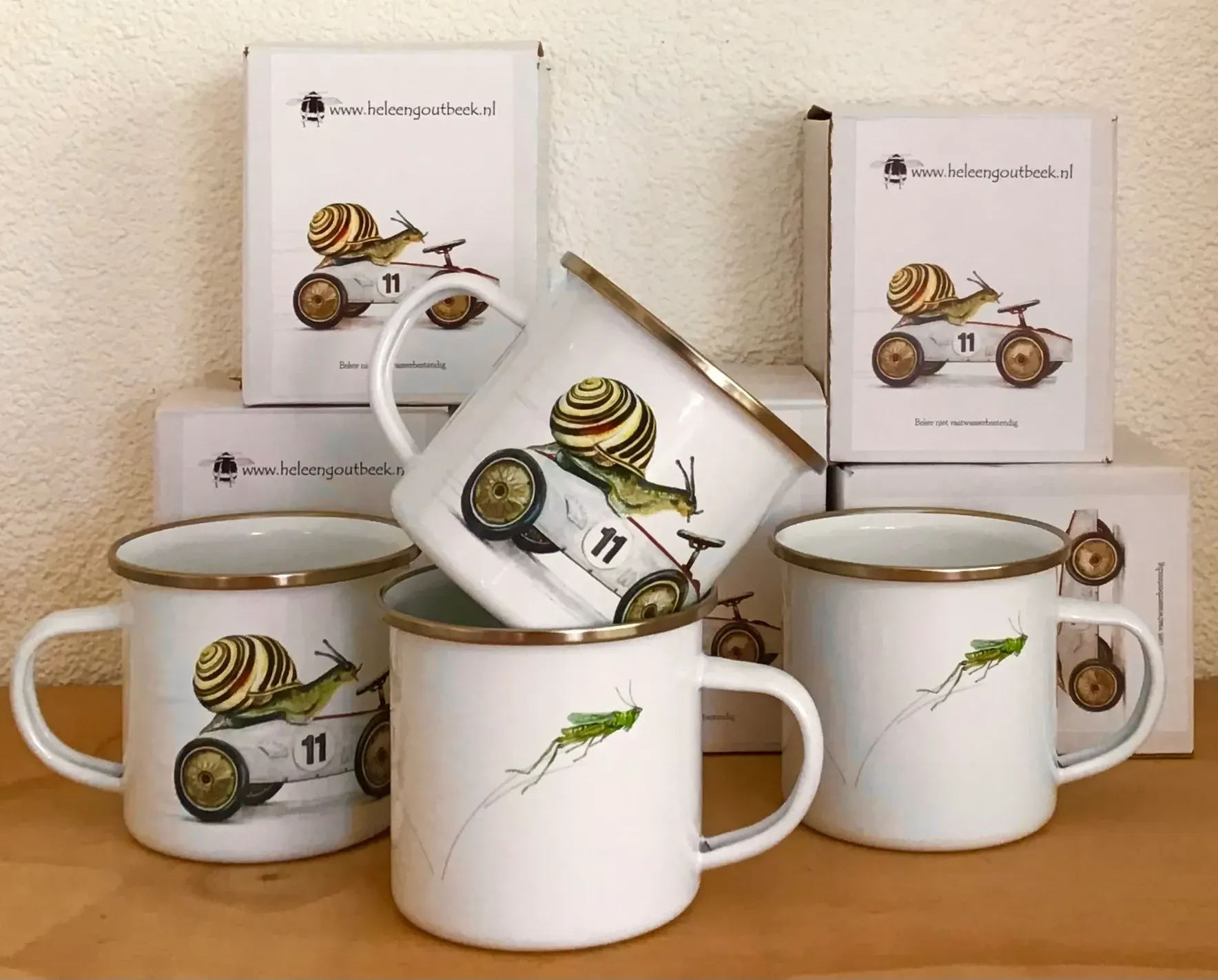De emaille mokken met de snelle slak en de springende sprinkhaan zijn te koop voor € 9,50